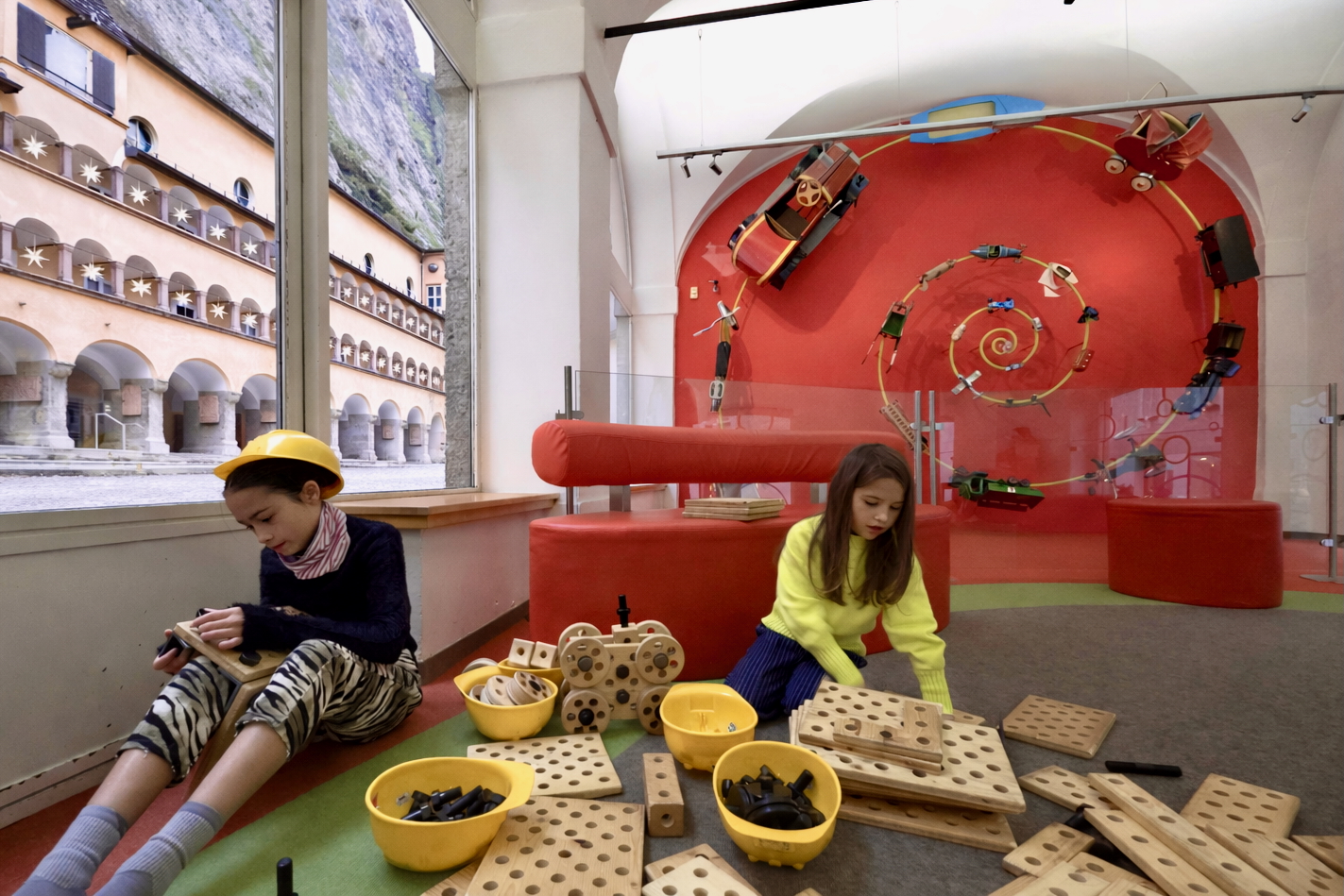 – al piano terra: ampi spazi per giocare, correre e sperimentare, piste di biglie, giochi di equilibrio e persino un gigantesco Matador, l’antico gioco di costruzioni in legno ancora popolare in Austria