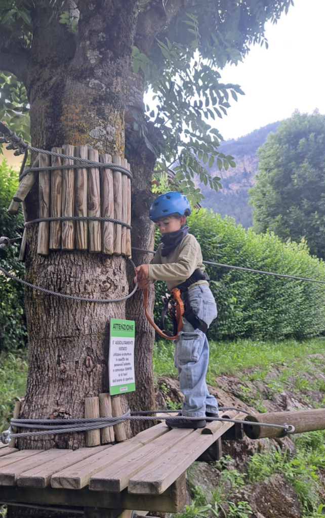 Accanto, il parco avventura completa perfettamente l’esperienza. Anche qui il formato è più raccolto rispetto a quelli in quota, ma proprio per questo risulta molto gestibile: percorsi sugli alberi, passaggi sospesi e piccole sfide pensate per bambini e famiglie.