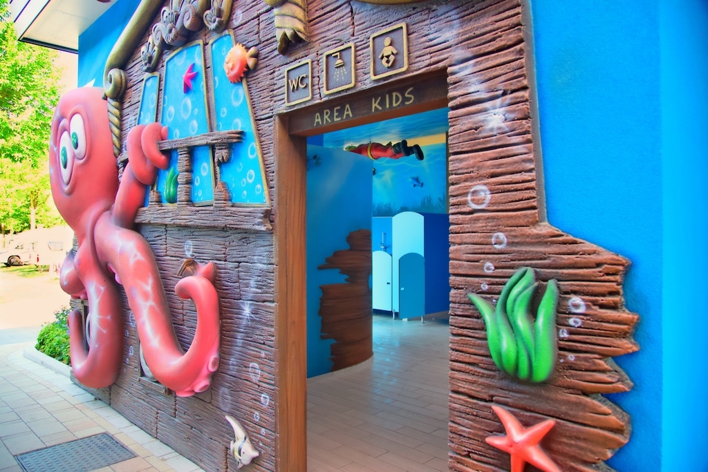Alcuni servizi igienici del campeggio sono dotati di area baby con docce, wc e lavandini a misura di bambino, fasciatoi e cabine doccia riscaldate.
